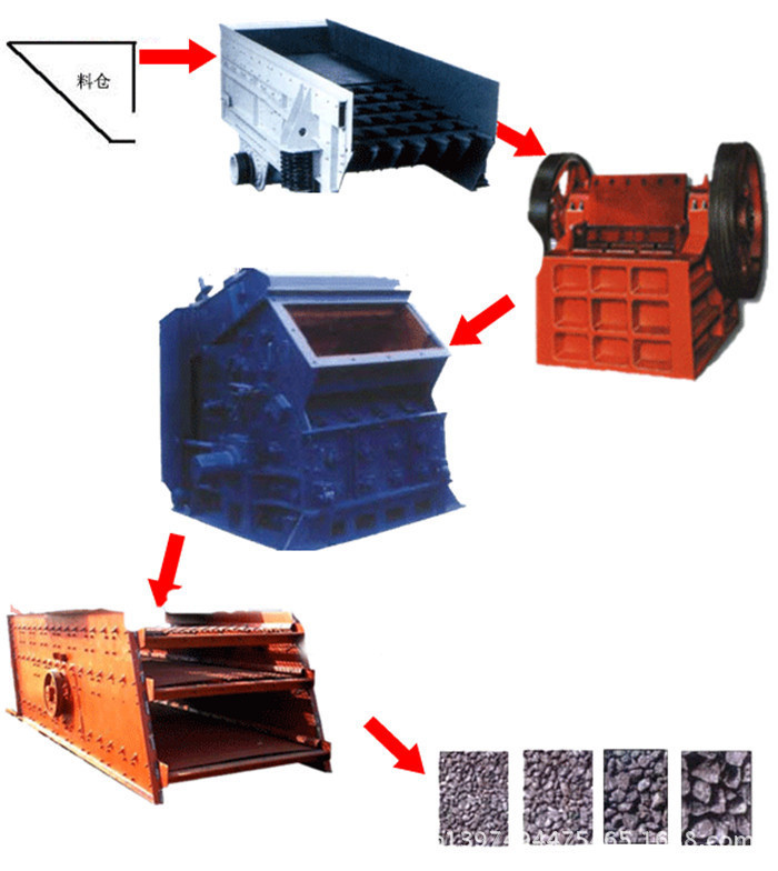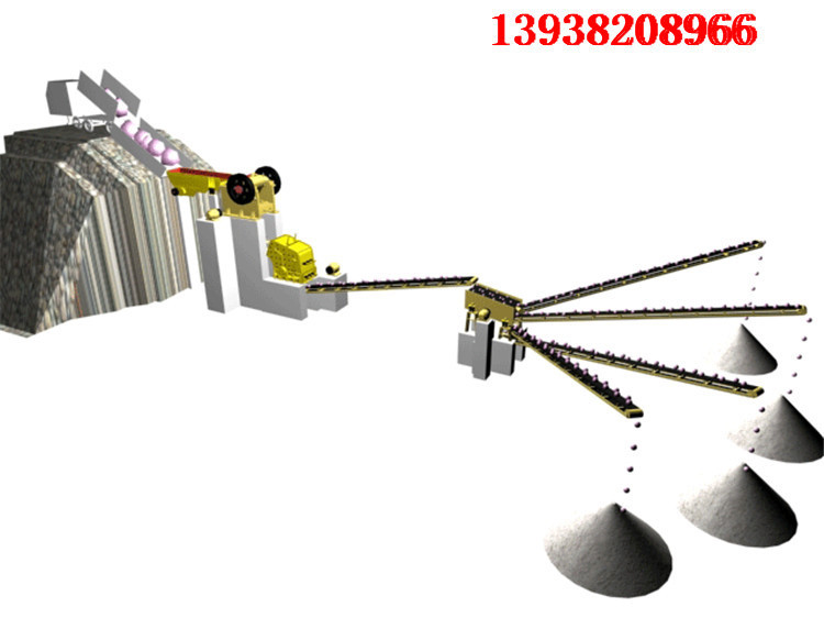 首先,石料由粗碎機進(jìn)行初步破碎,然后,產(chǎn)成的粗料由膠帶輸送機輸送至細(xì)碎機進(jìn)行進(jìn)一步破碎,細(xì)碎后的石料進(jìn)振動篩篩分出兩種石子,滿足制砂機進(jìn)料粒度的石子進(jìn)制砂機制砂,另一部分返料進(jìn)細(xì)破。進(jìn)制砂機的石子一部分制成砂,經(jīng)洗砂機(可選)清洗后制成成品砂,另一部分進(jìn)制砂機再次破碎。