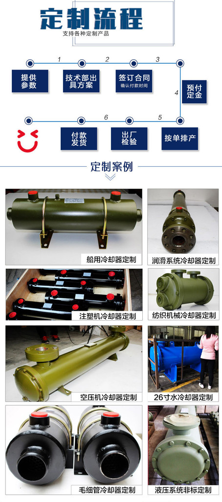 低和較清潔的油液的冷卻;列管式冷卻器可應用于塑料機械、液壓設備、空壓機、稀油油滑系統(tǒng)、液力偶合