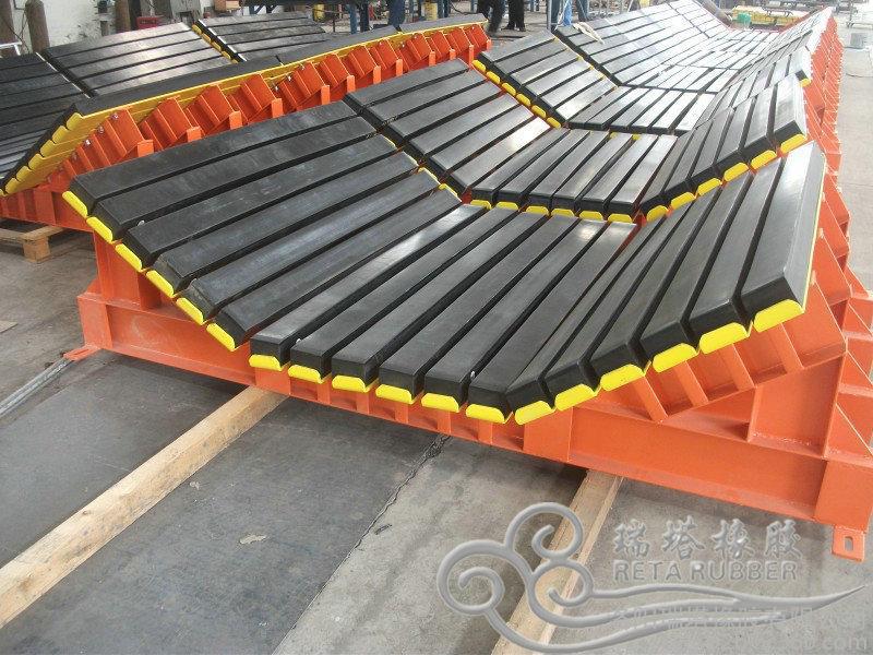 緩沖床主要用于替代傳統(tǒng)落料區(qū)緩沖托輥,緩沖床由緩沖條組成,而緩沖條主要應(yīng)用優(yōu)良的高彈性特種橡膠層充分有效吸收了物料下落時(shí)的沖擊力,大大降低了物料下落時(shí)對輸送帶的沖擊,真正的改善了落料點(diǎn)的受力狀況。