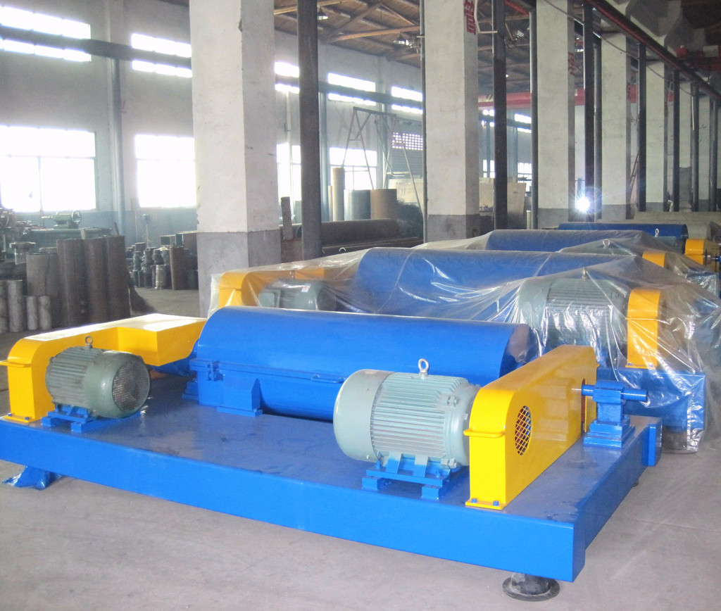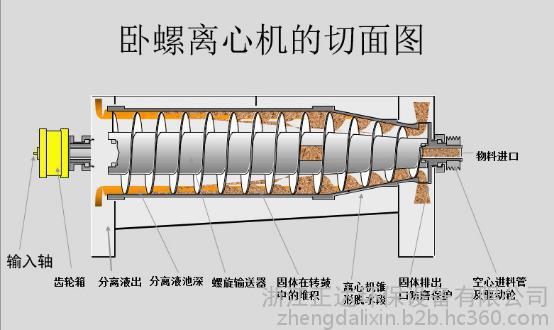 當(dāng)混合液體有進(jìn)料口進(jìn)入高速旋轉(zhuǎn)的轉(zhuǎn)鼓體內(nèi)腔后,混合液體中比重較大的固性物,在離心力的作用下,迅速陳江倒轉(zhuǎn)鼓內(nèi)壁,被螺旋推料器從固相出口排出轉(zhuǎn)鼓體外;同時(shí)比重較小的液相則在離心力的作用下形成內(nèi)層液環(huán),通過(guò)液相溢流口排出轉(zhuǎn)鼓體外。轉(zhuǎn)鼓與螺旋推料器同時(shí)高速運(yùn)轉(zhuǎn),由于兩者之間存在一定的轉(zhuǎn)速差,使得沉降在轉(zhuǎn)鼓壁上固性物不間斷地被螺旋推料器推送至出液口排出,整個(gè)分離過(guò)程連續(xù)進(jìn)行。