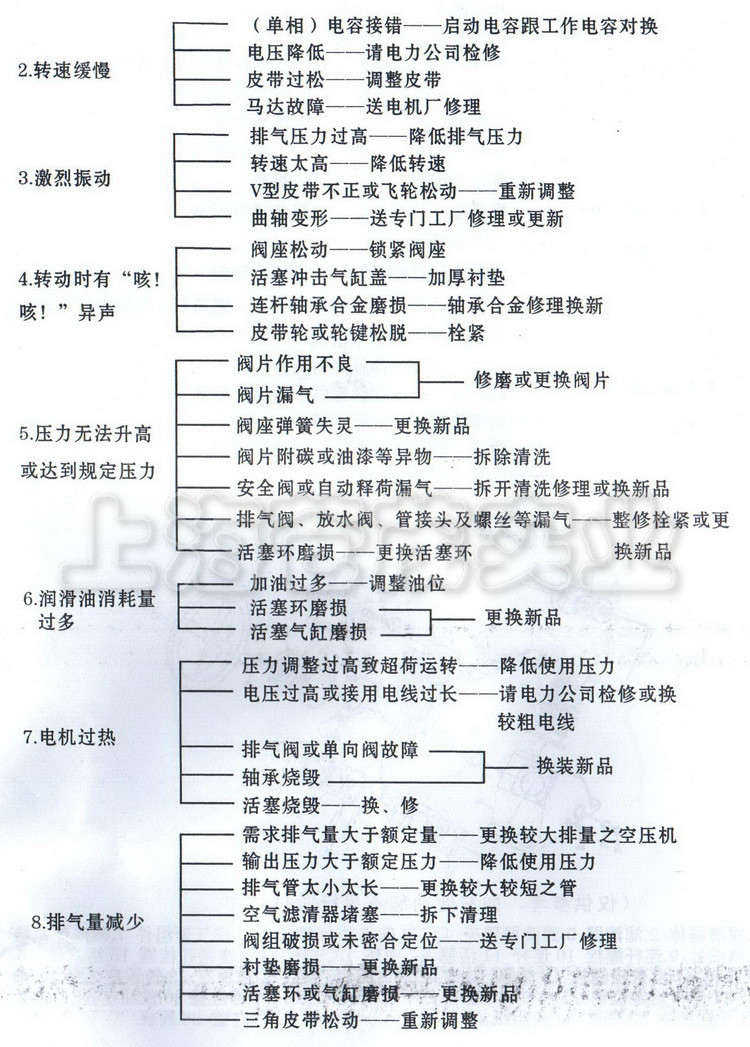 5.2.3起動后若沒有異音,則將閥門關(guān)閉,使儲氣罐中的壓力逐漸升高到達預(yù)定的壓力。達到設(shè)定之壓力后,壓力開關(guān)自動切斷電源,電機停止運轉(zhuǎn)。