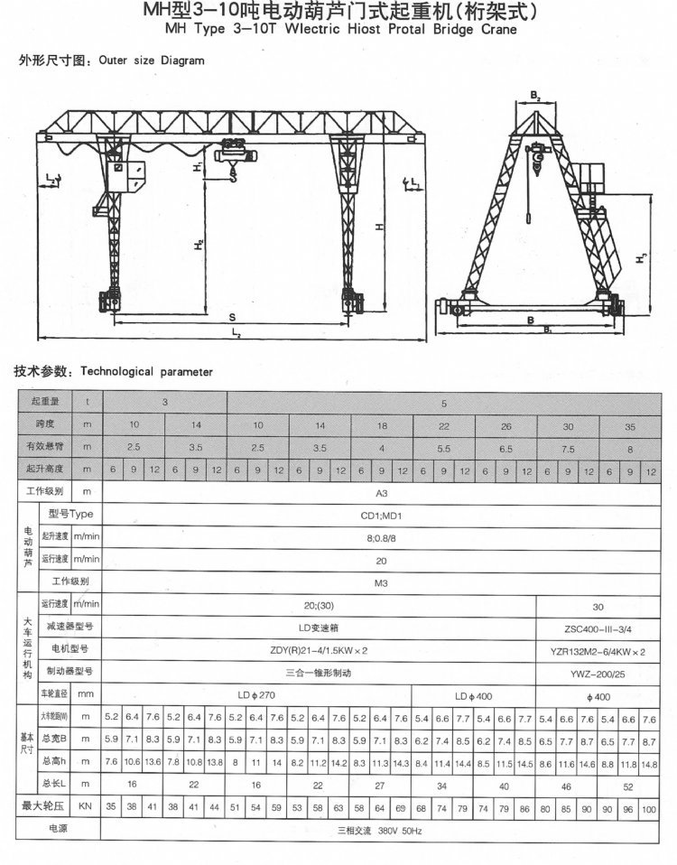 MH型電動葫蘆門式起重機與CD1、MD1等型號的電動葫蘆配套使用,是一種有軌運行的小型起重機,適用起重量5~20T,適用跨度為14~35m,工作環(huán)境-20℃~+40℃ MH型電動葫蘆門式起重機 為一般用途起重機,多用于露天場所及倉庫的裝卸或抓取物料。本產(chǎn)品有地面操控和室內(nèi)操控兩種形式。(此價格不包含葫蘆,檢修平臺,梯子平臺?詹偌1萬)