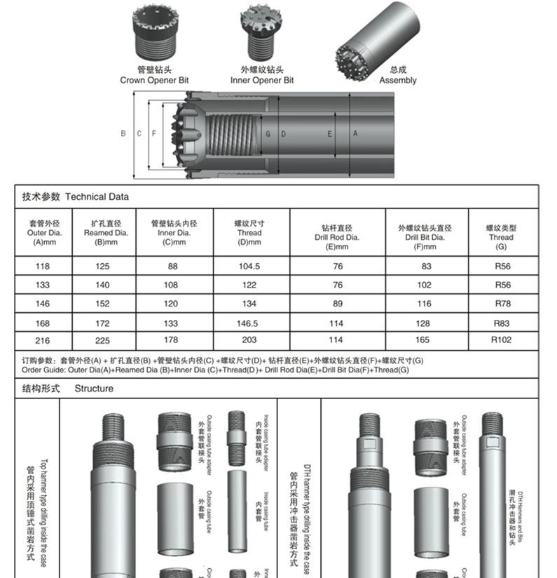 - 外波形螺紋連接,風(fēng)壓為0.5-0.7Mpa,采用沖擊式套管鉆具。