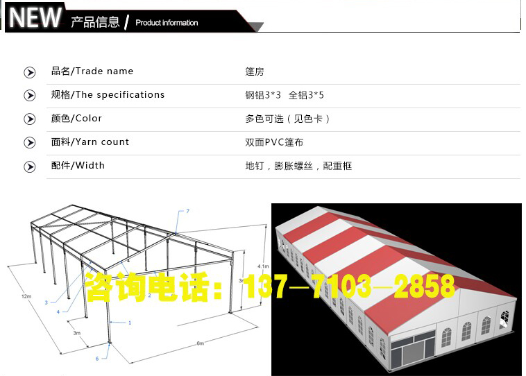 我公司生產(chǎn)各類篷房,用于婚慶、活動、商家推廣、展覽展銷等。跨度有常規(guī)的,也可接受定制。鋁合金篷房與鋼鋁篷房兩種材質(zhì)。
