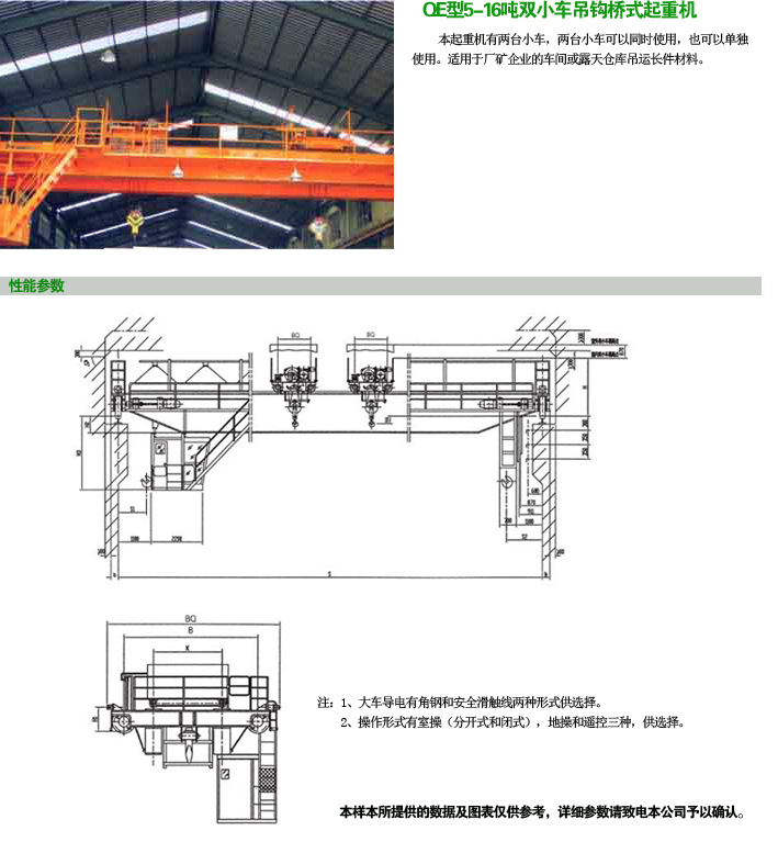 本起重機(jī)有兩臺(tái)小車,兩小車可以同時(shí)使用,也可以單獨(dú)使用,適用于廠礦企業(yè)的車間或露天倉(cāng)庫(kù)吊運(yùn)長(zhǎng)件材料(木材,紙筒,管封,棒材)。