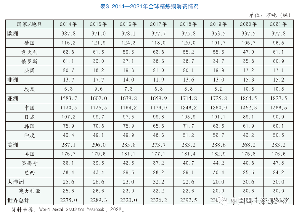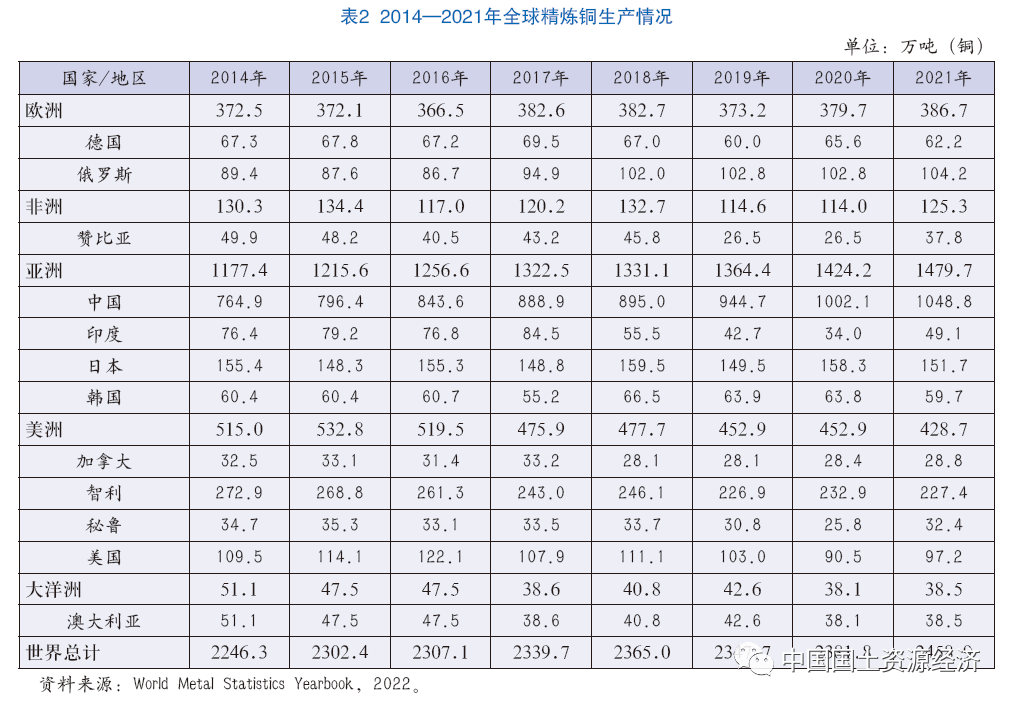 精煉銅是銅精礦或廢銅二次回收的冶煉核心產(chǎn)品,也是資源轉(zhuǎn)化為基礎(chǔ)原材料的必須環(huán)節(jié)。2021年,雖然智利、秘魯?shù)葒揖珶掋~產(chǎn)量有所波動,但是在中國、美國等國家增產(chǎn)的帶動下,全球精煉銅產(chǎn)量表現(xiàn)為穩(wěn)中趨增。2021年,全球精煉銅產(chǎn)量為2458.9萬噸,較2020年增長3.2%。目前,全球有近50個國家和地區(qū)生產(chǎn)精煉銅,但是精煉銅生產(chǎn)屬于高耗能產(chǎn)業(yè),發(fā)達(dá)國家和地區(qū)對銅冶煉項目一般不鼓勵發(fā)展,而是提倡進(jìn)口消費(fèi)。例如歐洲,精煉銅生產(chǎn)規(guī);痉(wěn)定在370萬~390萬噸。只有發(fā)展中國家為了滿足自身發(fā)展或配合其他產(chǎn)業(yè)發(fā)展等方面的需要才不斷擴(kuò)張精煉銅產(chǎn)量規(guī)模。我國是這方面最典型的例子,2021年我國精煉銅產(chǎn)量為1048.8萬噸,較2020年增長4.7%,占全球總產(chǎn)量的42.7%,是全球銅精礦消費(fèi)增長的主要貢獻(xiàn)國(表2)。由于我國精煉產(chǎn)能仍處于擴(kuò)張期,精煉銅產(chǎn)量仍將會保持在較高水平,因此亞洲地區(qū)精煉銅產(chǎn)量居全球之首的地位不僅不會改變,而且在全球的占比還將繼續(xù)增加。
