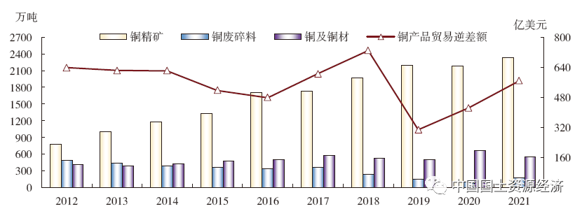需要注意的是,我國銅產(chǎn)業(yè)鏈非常脆弱:上游的資源采掘業(yè)不能滿足中游冶煉需要,而冶煉的產(chǎn)品又不能滿足下游對精煉銅的消費(fèi)需要,在產(chǎn)業(yè)鏈的每個環(huán)節(jié)都要靠進(jìn)口來彌補(bǔ)其中的供需差距。換言之,我國銅工業(yè)的蓬勃發(fā)展及精煉銅消費(fèi)的快速擴(kuò)張,都是建立在大規(guī)模利用國外資源的基礎(chǔ)之上。2021年,我國除進(jìn)口銅精礦以外,還進(jìn)口未鍛軋銅496.6萬噸,較2020年增長6.3%;進(jìn)口銅廢碎料169.3萬噸,較2020年增長79.6%。2021年我國銅產(chǎn)品貿(mào)易逆差為567.6億美元,較2020年增長33.9%(圖1)。