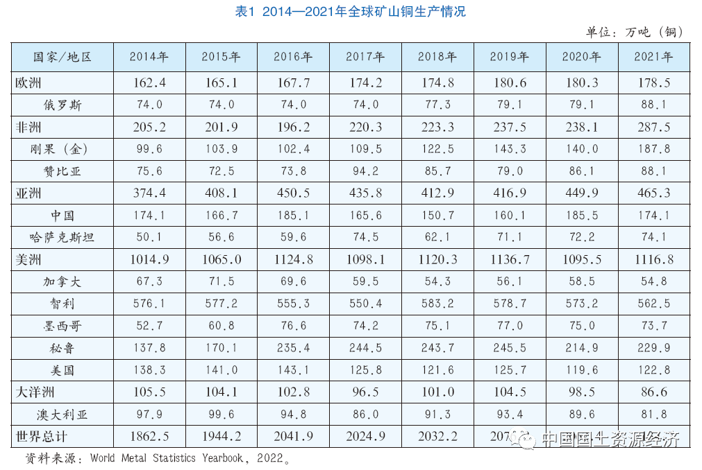 據(jù)《世界金屬統(tǒng)計》數(shù)據(jù),2021年全球礦山銅總產(chǎn)量為2134.7萬噸,較2020年增長3.5%。美洲是全球礦山銅生產(chǎn)的核心區(qū),2021年產(chǎn)量為1116.8萬噸,占全球總產(chǎn)量的52.3%,其中智利、秘魯是驅(qū)動美洲穩(wěn)產(chǎn)的主要力量,2021年兩國的產(chǎn)量分別為562.5萬噸、229.9萬噸,分別占全球總產(chǎn)量的26.4%、10.8%。隨著我國礦山銅產(chǎn)量的增加,2021年亞洲的礦山銅產(chǎn)量達(dá)到465.3萬噸,約占全球總產(chǎn)量的21.8%。其中,我國產(chǎn)量為174.1萬噸,占全球總產(chǎn)量的8.2%。此外,全球其他礦山銅產(chǎn)量大國還包括俄羅斯、剛果(金)、贊比亞、美國、哈薩克斯坦等國家,這些國家2021年的礦山銅產(chǎn)量與2020年相比均有不同程度的增加(表1)。從未來趨勢看,隨著新建、擴(kuò)建產(chǎn)能的陸續(xù)釋放,非洲礦山銅產(chǎn)量還將保持增長態(tài)勢,但是改變不了美洲作為全球最大銅精礦生產(chǎn)基地的格局。