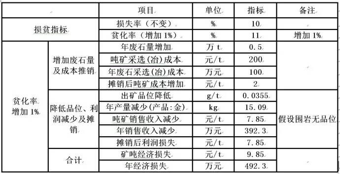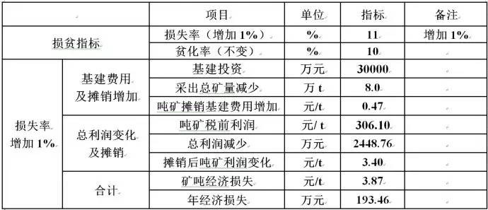 假定損失率不變,當貧化率增加1%時,噸礦經(jīng)濟損失9.85元,年經(jīng)濟損失492萬元。