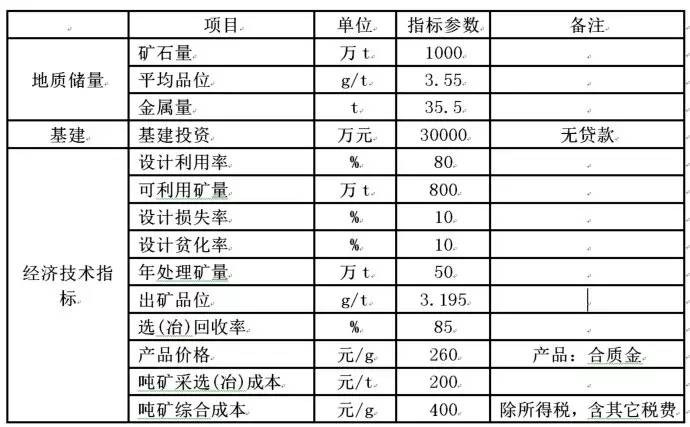 該金礦為大型金礦,年生產(chǎn)規(guī)模為50萬噸,主要參數(shù)如下表: