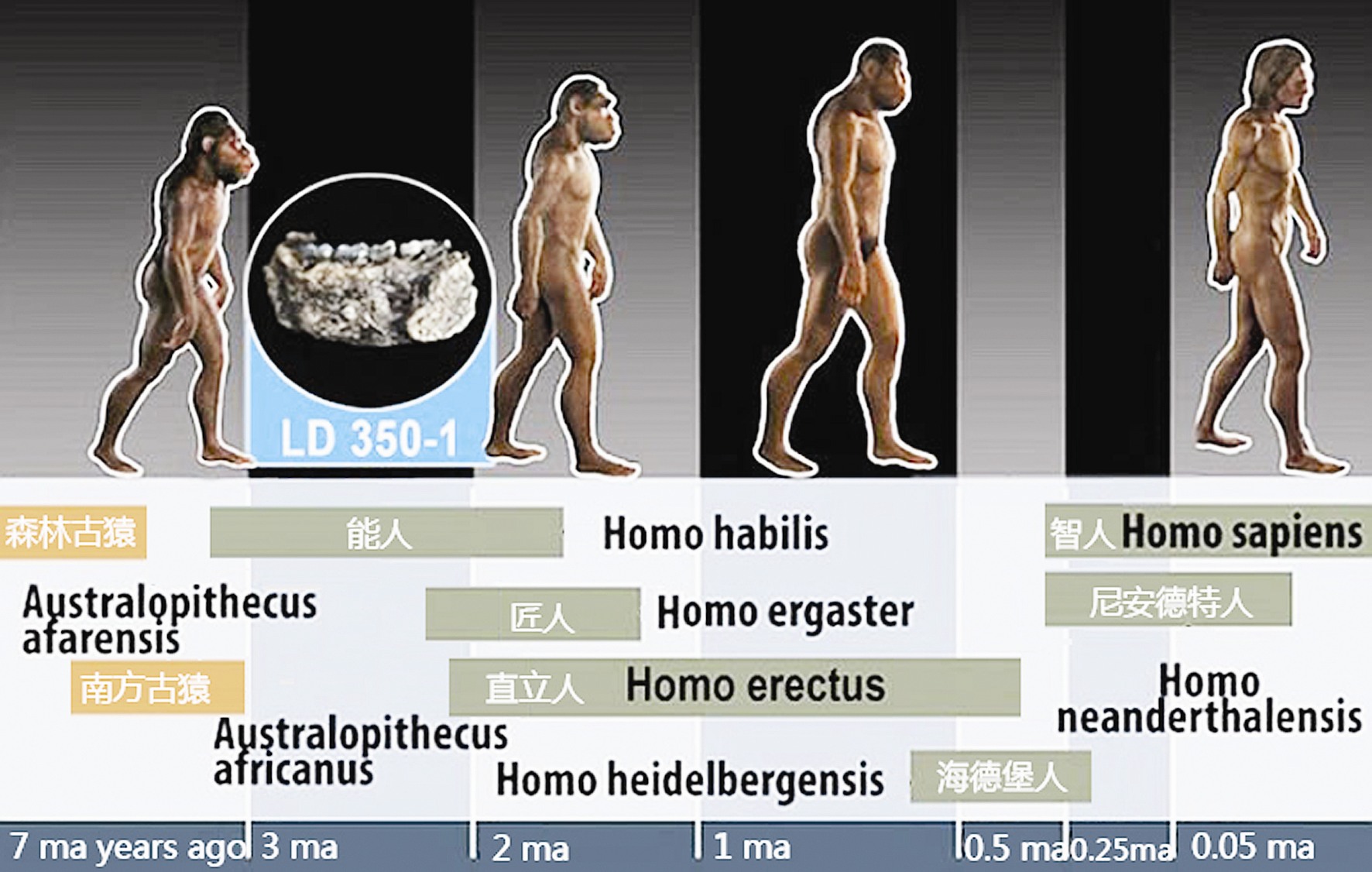 國際科學(xué)界普遍認(rèn)為,人與猿的分異大約在距今700萬年前后,人類最早起源于非洲;但也有少數(shù)學(xué)者認(rèn)為人類的起源中心不止一個。在歐亞大陸發(fā)現(xiàn)的古人類大約有4大類:直立人、海德堡人、尼安德特人和智人。西方學(xué)者認(rèn)為,直立人是第一批走出非洲的人,然后再擴散到歐洲和亞洲。非洲出現(xiàn)的海德堡人距今約30萬年-12.5萬年;歐洲發(fā)現(xiàn)的海德堡人距今約60萬年-20萬年。亞洲先后也發(fā)現(xiàn)了一些具有與海德堡人特征相似的古人類化石,但由于化石保存不好,始終沒有定論。西方學(xué)者一般認(rèn)為,亞洲還沒有發(fā)現(xiàn)過真正的海德堡人類型的化石。