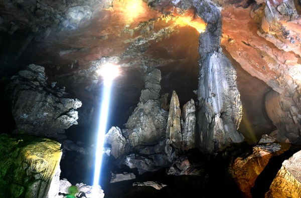 道縣橋頭賽巖溶洞位于橋頭鎮(zhèn)東南1.4公里處的賽巖村附近,由溶洞及地下河構(gòu)成,探明長(zhǎng)度280余米,洞穴總體走向?yàn)?0度,已探明部分洞體由3個(gè)大廳連串而成,并通過(guò)地下河通達(dá)地面。溶洞中最大的洞廳面積約2400平方米,最大的石柱高達(dá)28米,最粗壯的石筍直徑達(dá)6米,另有大量的中小型石筍、石柱、鐘乳石、石梯田、石幔、鵝管等景觀。