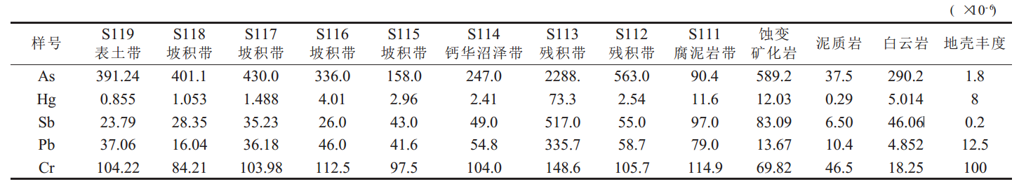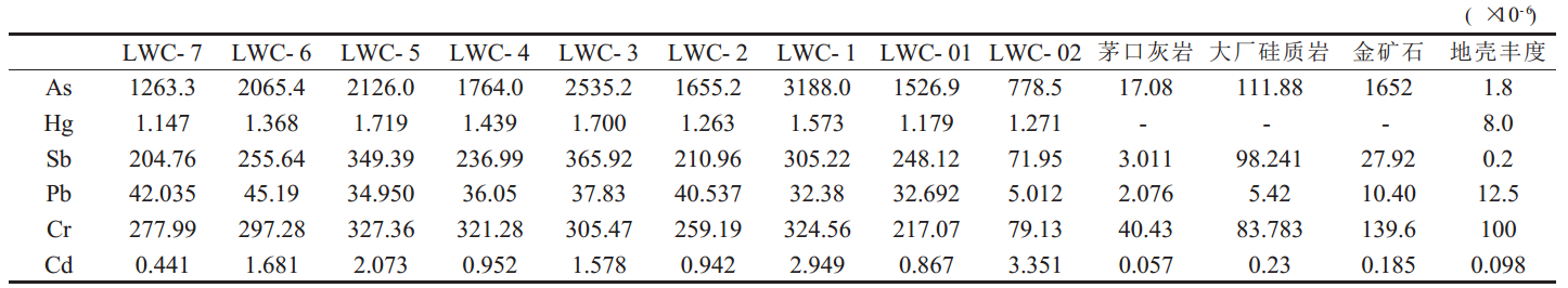 高嶺石中As的含量高達 778.5×10-6~3188.0×10-6之間。Cr、Sb也具有較高的含量。與茅口灰?guī)r、大廠硅質(zhì)巖和紫木幽原生卡林型金礦石相比,高嶺石中Pb、Cr、Cd等的含量均明顯高于各類巖( 礦) 石, 其中 Cr、Cd、Pb 等的含量高出各類巖( 礦) 石幾至幾十倍。與地殼豐度相比, 高嶺石中 Cr、Pb、Cd、As、Sb、Hg 的含量明顯較高, 其中 As、Sb、Hg 的含量高達上百倍。
