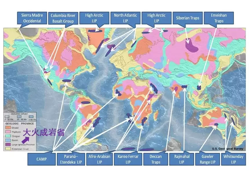 找遍中國行政區(qū)劃圖,卻沒發(fā)現(xiàn)有叫“大火成巖”的省,難道是國外的某?歷經(jīng)三天三夜,翻看世界各國行政區(qū)劃圖還是沒找到。直到后來看見一張地質(zhì)圖(如下圖),才看到上面標(biāo)了大火成巖。↙arge Igneous Provinces,簡稱LIP),原來大火成巖省是指特定的地質(zhì)區(qū)域,那么什么是大火成巖省呢?