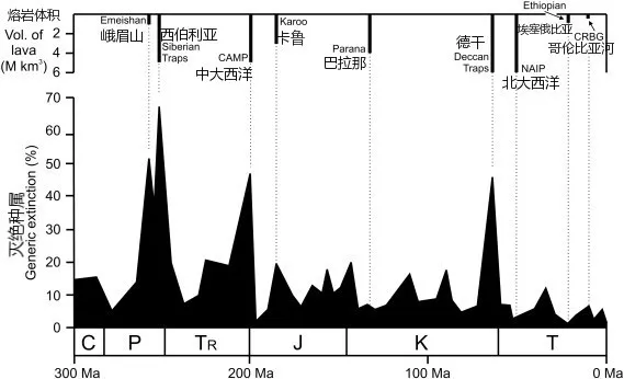 地球上發(fā)生過多次生物滅絕事件,盡管生物滅絕的原因尚不完全清楚,但是地質(zhì)歷史上多次生物大滅絕的時間與大火成巖省火山活動有著精確的對應(yīng)關(guān)系(圖4),這不由得引發(fā)了人類無盡的遐想,科學(xué)家認為大火成巖省事件是導(dǎo)致生物大滅絕的主要誘因之一。