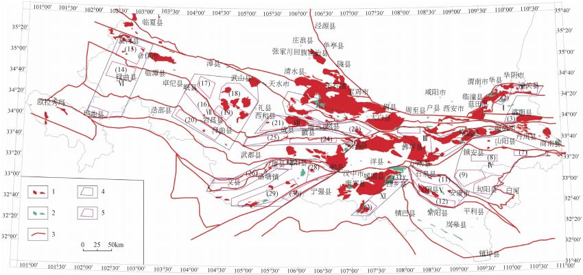 秦嶺成礦帶西起甘青交界,向東綿延,穿甘、陜,抵豫、渝,北自甘肅臨夏-天水、陜西寶雞-西安-潼關(guān)一線起,向南止于甘肅瑪曲-文縣-康縣、陜西寧強-鎮(zhèn)巴-鎮(zhèn)坪一線,范圍包括秦嶺東段的陜西南部地區(qū)和秦嶺西段的甘肅南部地區(qū),地理坐標:東經(jīng)101°20'00''~111°00'00'',北緯31°40'00''~35°45'00''。全區(qū)東西長約600 km,南北寬200~300 km,總面積約16萬 km²。該區(qū)崇山峻嶺逶迤,盆地平原棋布,渭水洮河注黃,白龍嘉漢奔長,不僅是我國南北天然的地質(zhì)、地理、生態(tài)、氣候、環(huán)境,乃至人文的自然分界線,而且具有長期、復雜的地質(zhì)演化和成礦作用形成的極其豐富的礦產(chǎn)資源,對中華民族歷史發(fā)展起到至關(guān)重要的作用。中華人民共和國成立以來,區(qū)內(nèi)已發(fā)現(xiàn)各類型礦產(chǎn)地近千處,其中大中型礦產(chǎn)地百余處,成為我國重要的有色金屬、貴金屬礦產(chǎn)資源基地,為國民經(jīng)濟建設(shè)發(fā)展做出了卓越貢獻,目前金、鉬(鎢)、鉛鋅、銅、汞銻、鐵等已成為區(qū)內(nèi)的優(yōu)勢礦產(chǎn)資源。