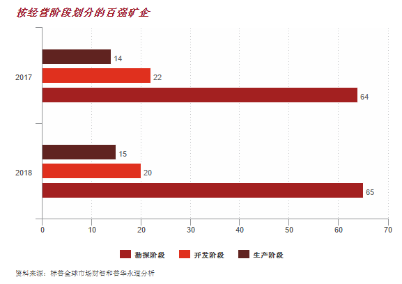 普華永道加拿大礦業(yè)主管合伙人Dean Braunsteiner2018年百強礦企的成員仍以勘探階段的礦業(yè)公司為主,幾乎占榜單的三分之二。開發(fā)階段和生產(chǎn)階段公司的比例分別為20%和15%,與前一年的數(shù)據(jù)一致。