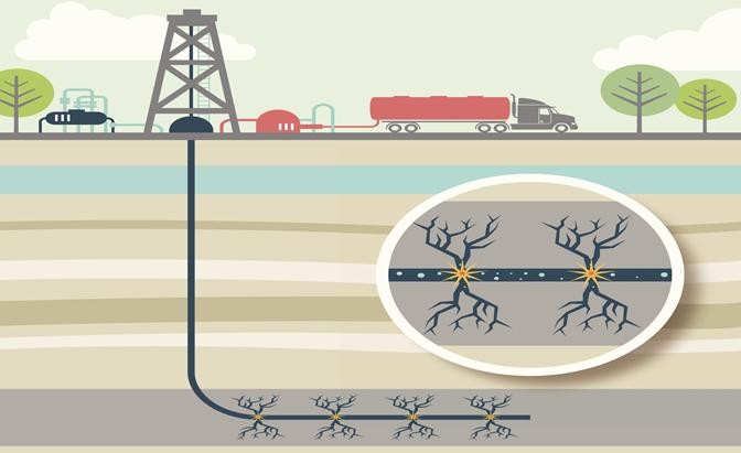 由于頁(yè)巖氣存在于上面所說的非常致密的黑色頁(yè)巖中,要開發(fā)頁(yè)巖氣就需要比開發(fā)常規(guī)天然氣更高的工藝技術(shù)。美國(guó)是世界上首個(gè)實(shí)現(xiàn)頁(yè)巖氣工業(yè)開發(fā)的國(guó)家,在頁(yè)巖氣勘探開發(fā)過程中,美國(guó)人逐漸摸索試驗(yàn)形成了“水平井+分段壓裂改造”的工藝技術(shù)。通過在地下幾千米深處的頁(yè)巖層中,人工鉆一口可穿行頁(yè)巖1000多米的“水平井”。先下入管柱封固地層,然后在鋼管上分段射開一些小孔,再通過地面高壓設(shè)備——壓裂車將清水混合著粗砂注入地層里,在頁(yè)巖中壓出一些裂縫,被稱作“水力壓裂”。“水力壓裂”可以形容為給地層打針。針管即是井桶,藥水即是清水和砂子,清水和砂子壓到地層中,在地層中壓出裂縫通道,使頁(yè)巖氣沿著裂縫通道進(jìn)入井筒,進(jìn)而被采出地面。
