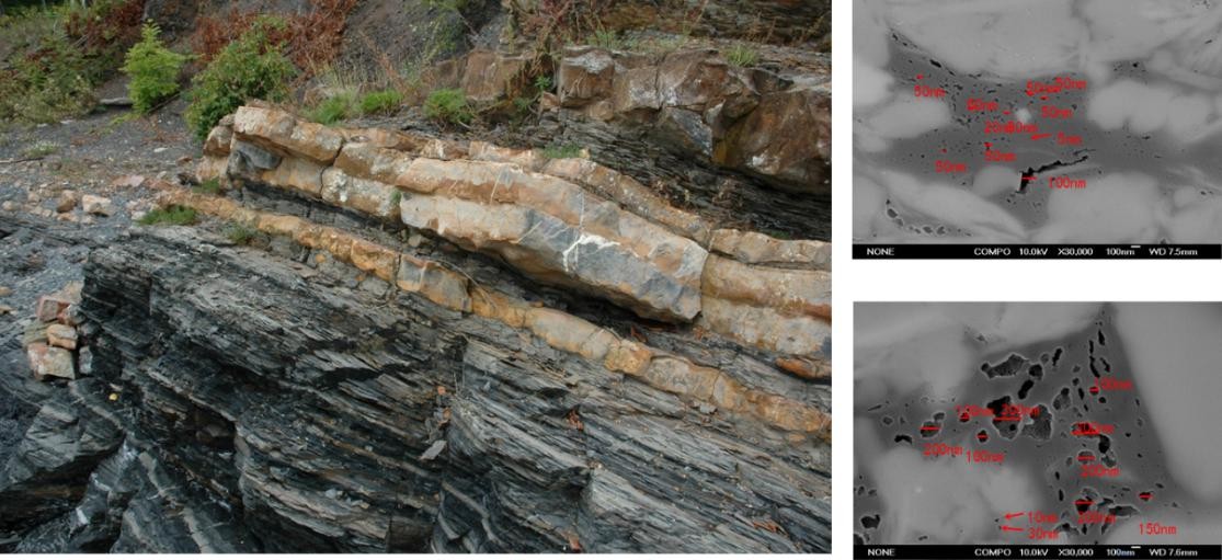 黑色巖石和其中的微小孔隙(放大幾萬倍)