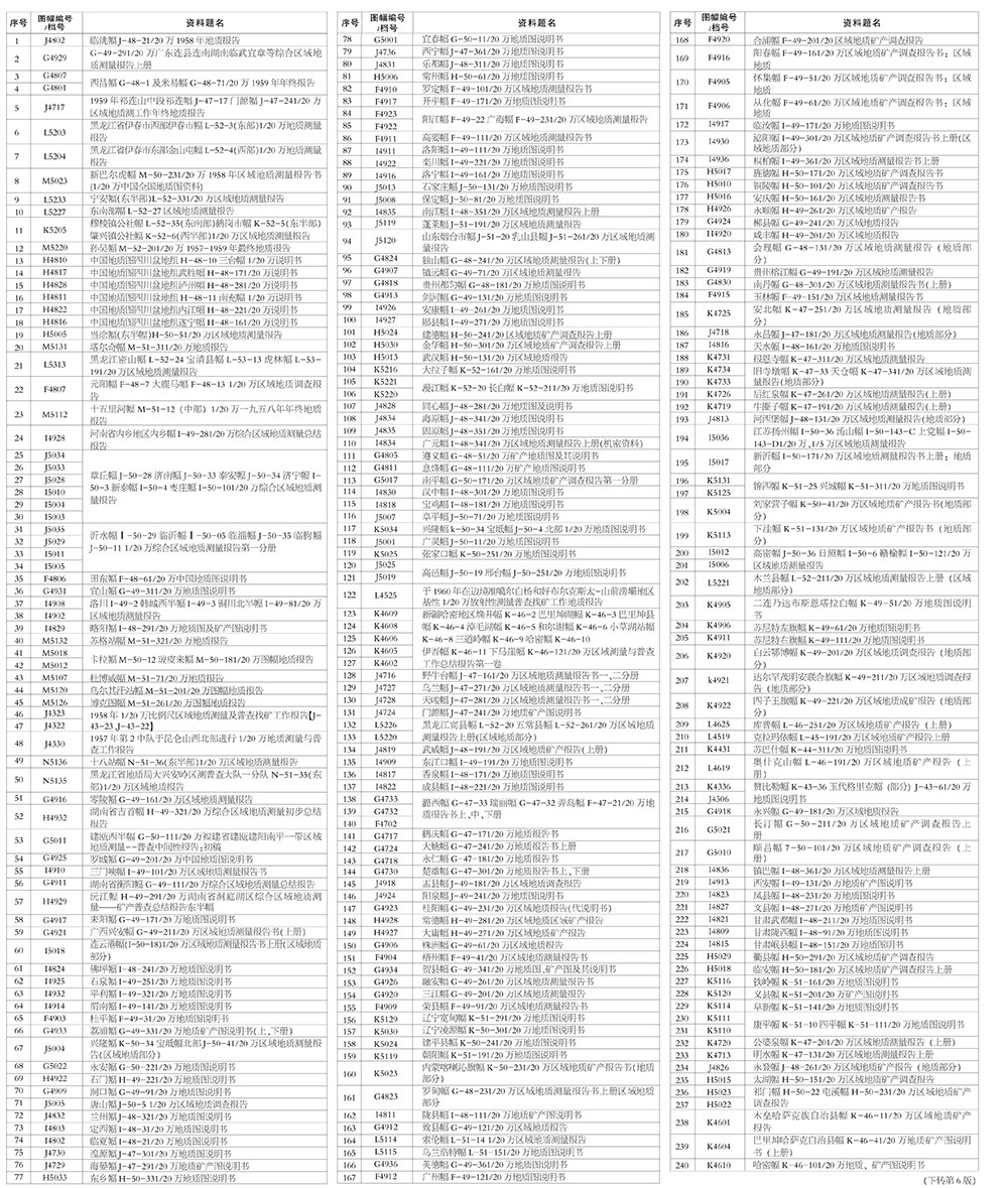 依據(jù)現(xiàn)行國(guó)家秘密事項(xiàng)目錄及規(guī)定程序,全國(guó)地質(zhì)資料館對(duì)部分館藏地質(zhì)資料進(jìn)行了公開化處理,形成了1013份公開版地質(zhì)調(diào)查成果資料,特此公示。