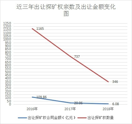 ——探礦權(quán)出讓宗數(shù)和出讓金額急劇下降。2018年全國(guó)地質(zhì)勘查成果通報(bào)的數(shù)據(jù)顯示,2018年非油氣探礦權(quán)出讓宗數(shù)與2016年相比,減少819宗,下降了70.3%;非油氣探礦權(quán)出讓收益金額與2016年相比,減少了103.78億元,下降了94.47%。