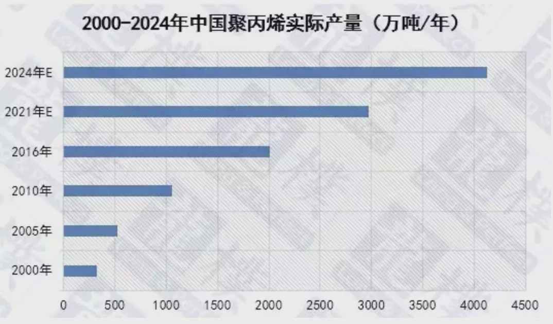 2018年中國(guó)聚丙烯生產(chǎn)能力達(dá)到2621萬噸/年,散落在山東和江浙一帶。2010年,中國(guó)聚丙烯生產(chǎn)能力為1054.73萬噸/年,為首次突破千萬噸門檻。中國(guó)聚烯烴用6年時(shí)間,2016年,基建完成生產(chǎn)能力突破2000萬噸/年,神勇似中國(guó)高鐵。2021年,中國(guó)聚丙烯生產(chǎn)能力將突破3000萬噸/年。