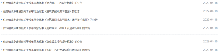 4月18日,住建部發(fā)布4項(xiàng)國家標(biāo)準(zhǔn),自2022年5月1日起實(shí)施;兩項(xiàng)行業(yè)標(biāo)準(zhǔn),自2022年3月1日起實(shí)施。其中: