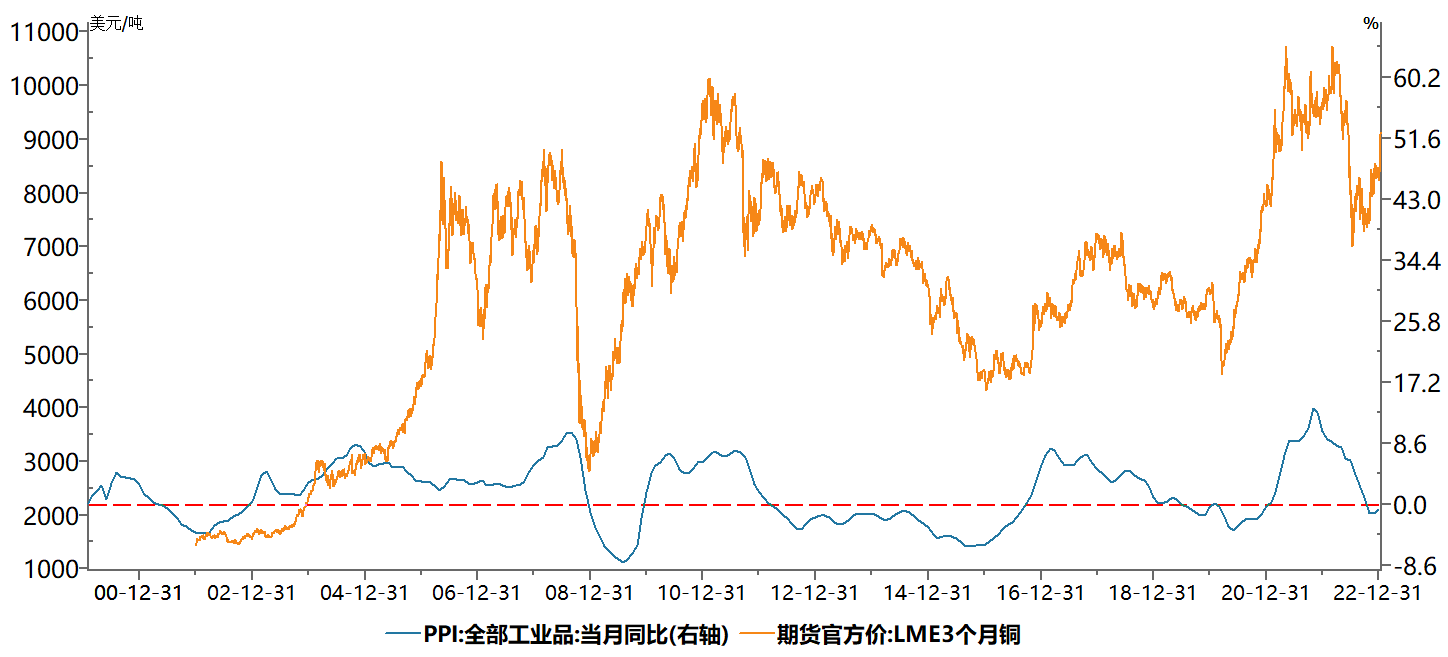 2021年以來,中國的工業(yè)品出廠價格指數(shù)PPI與國外的高通脹背道而馳,處于持續(xù)下行之中。2022年10-11月,連續(xù)兩個月負(fù)增長1.3%。2022年12月是本輪下行期的首次回升。在歷史上,我們通常可以看到中國礦產(chǎn)品價格變化與PPI之間的同步同向關(guān)系。