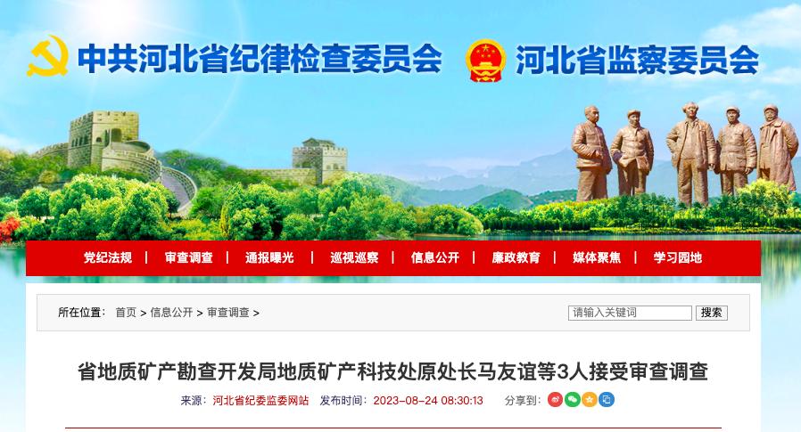 8月24日,河北省紀(jì)委監(jiān)委通報(bào),河北省地質(zhì)礦產(chǎn)勘查開發(fā)局(以下稱“河北省地礦局”)地質(zhì)礦產(chǎn)科技處原處長(zhǎng)馬友誼、省地質(zhì)礦產(chǎn)勘查開發(fā)局第三地質(zhì)大隊(duì)(河北省張承地區(qū)生態(tài)環(huán)境保護(hù)與修復(fù)技術(shù)創(chuàng)新中心)副隊(duì)長(zhǎng)劉月東、中國(guó)地質(zhì)環(huán)境監(jiān)測(cè)院人事處處長(zhǎng)李志強(qiáng)涉嫌嚴(yán)重違紀(jì)違法,目前正接受省紀(jì)委監(jiān)委紀(jì)律審查和監(jiān)察調(diào)查。