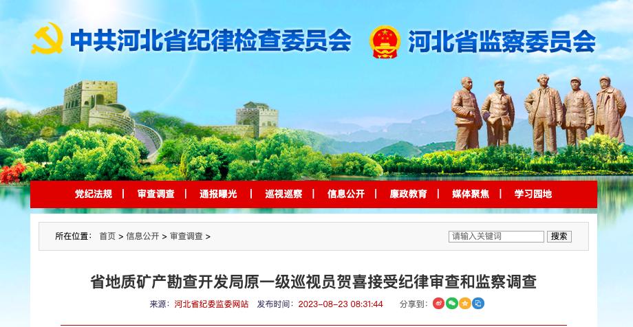 8月23日,河北省紀(jì)委監(jiān)委通報(bào),河北省地礦局原一級(jí)巡視員賀喜涉嫌嚴(yán)重違紀(jì)違法,目前正接受省紀(jì)委監(jiān)委紀(jì)律審查和監(jiān)察調(diào)查。