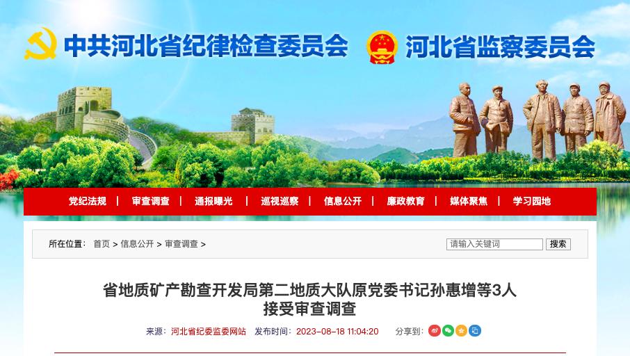 8月18日,河北省紀(jì)委監(jiān)委通報(bào),河北省地礦局第二地質(zhì)大隊(duì)原黨委書記孫惠增,省地礦局第三地質(zhì)大隊(duì)黨委書記武曉紅,河北地礦科技開發(fā)總公司原黨委書記、總經(jīng)理杜光涉嫌嚴(yán)重違紀(jì)違法,目前正接受省紀(jì)委監(jiān)委紀(jì)律審查和監(jiān)察調(diào)查。