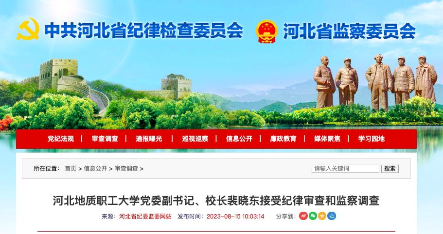 8月15日,河北省紀(jì)委監(jiān)委通報(bào),河北省地礦局黨組成員、副局長(zhǎng)李健,河北地質(zhì)職工大學(xué)黨委副書記、校長(zhǎng)裴曉東涉嫌嚴(yán)重違紀(jì)違法,目前正接受省紀(jì)委監(jiān)委紀(jì)律審查和監(jiān)察調(diào)查。河北省地礦局官網(wǎng)顯示,河北地質(zhì)職工大學(xué)系該局局屬單位。