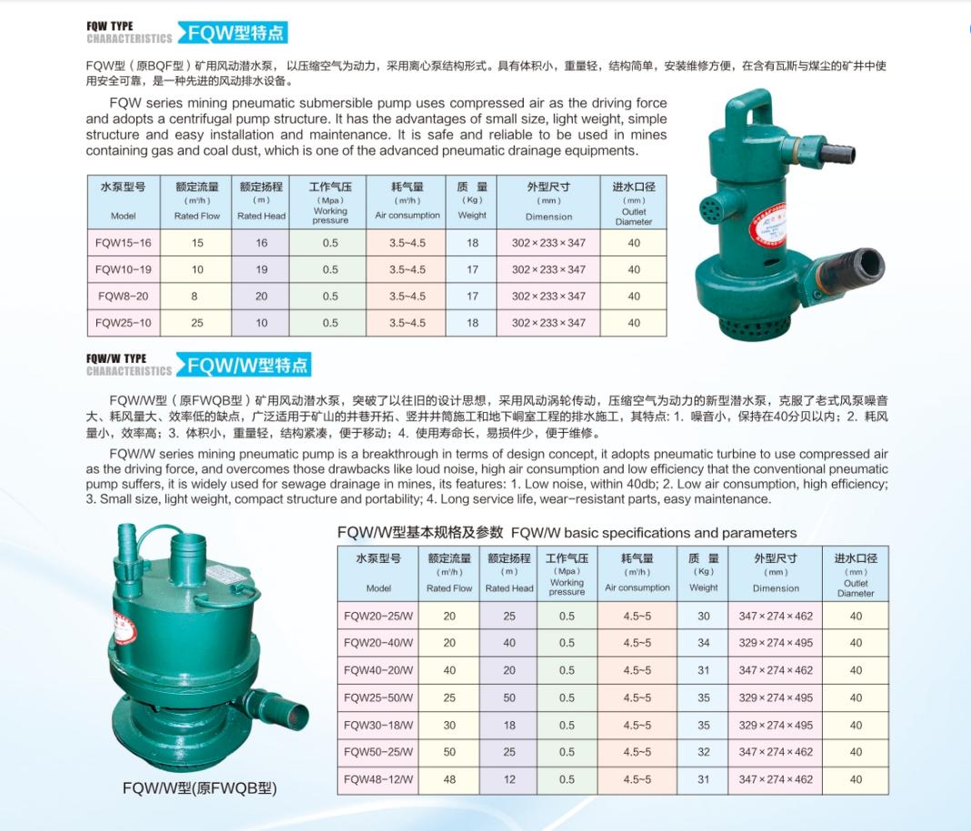 礦用風動潛水泵以下(簡稱水泵)是我公司自行研制開發(fā)的一種新產(chǎn)品,本產(chǎn)品采用轉(zhuǎn)子與泵體同軸聯(lián)結(jié)的機械產(chǎn)品,采用立式結(jié)構(gòu)、下泵式。執(zhí)行標準:MT/T315-92、Q/KA003-2013。煤礦用風動潛水泵結(jié)構(gòu)緊湊,移動、裝拆、維修方便。泵體渦道采用高效節(jié)能水力模型,葉輪特殊設(shè)計。該水泵排污水能力強,流量大,揚程高等優(yōu)點。 FQW 型系列水泵適用于含有瓦斯與煤塵爆炸危險場所排水作業(yè),可廣泛用于煤礦井下任何作業(yè)面,輸送含有煤粉、泥沙顆粒的地下水,使用安全、可靠,并有效地改善現(xiàn)場空氣質(zhì)量。