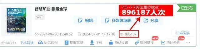 截止7月7日,短短幾天的傳播時間,《智慧礦業(yè) 服務(wù)全球》電子?閱讀量已破89萬。?鸨拈喿x量再次證明了CIMESE2024在礦業(yè)領(lǐng)域的活躍度、號召力和市場的巨大需求。