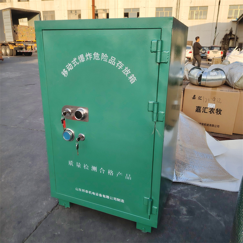 移動式爆炸危險品存放箱,也叫爆炸物品存放柜、火工品存放柜、炸藥臨時保管箱、雷管防爆箱。箱體外置6.0mm~8.0mm厚防爆鋼板,內置10.0mm絕緣木板,底部鋪設有2.0mm防靜電膠墊,四周鋪設有抗震阻燃氈。鎖具采用的是GA機械鎖具兩把,以及一把機械轉盤密碼鎖,爆破員和安全保管員分開保管鑰匙,同時使用打開領取火工品。
