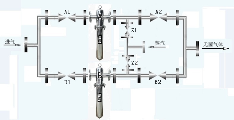 1. 安裝時,必須按照過濾器上的空氣進出口標(biāo)簽連接好管道。否則將進出口反裝會嚴(yán)重影響過濾效果。為了便于使用和更換維修,過濾器應(yīng)按下圖所示的標(biāo)準(zhǔn)管線進行安裝。