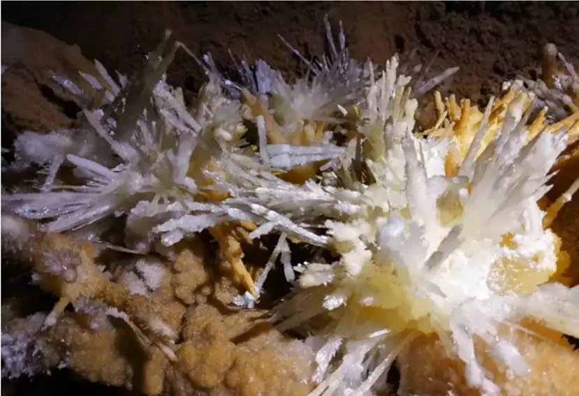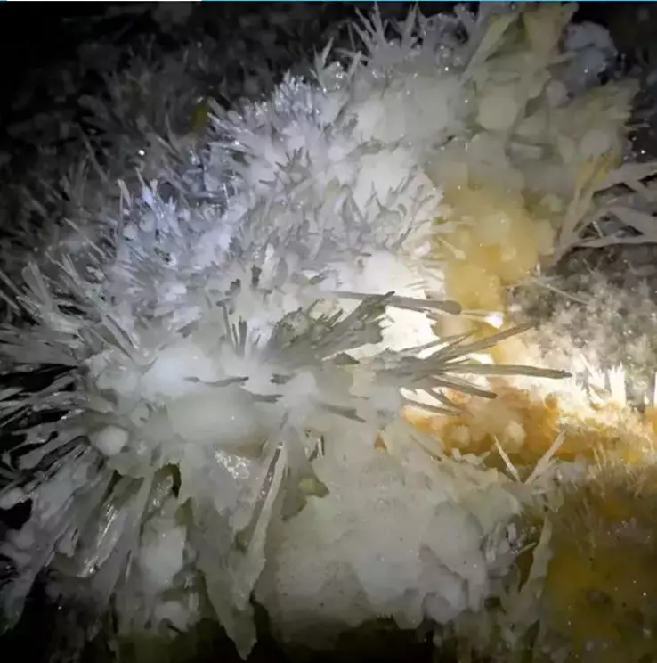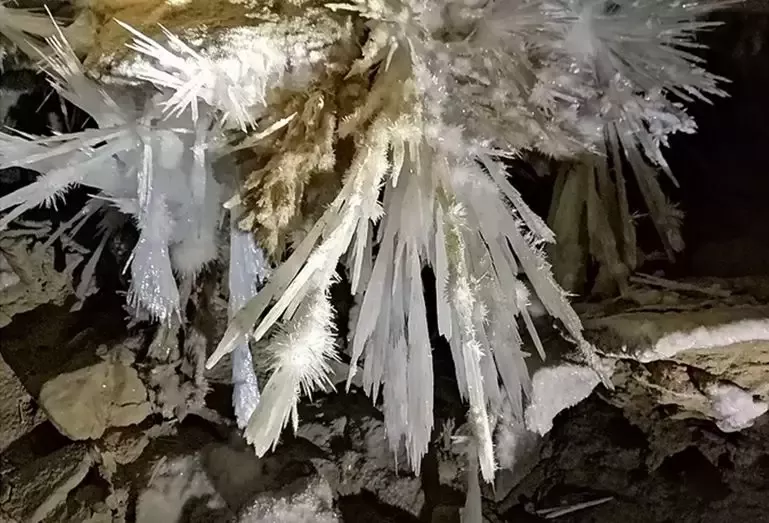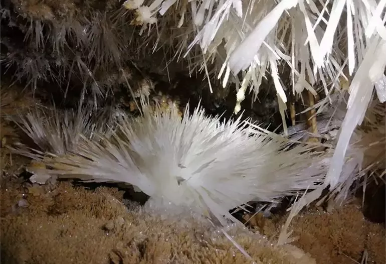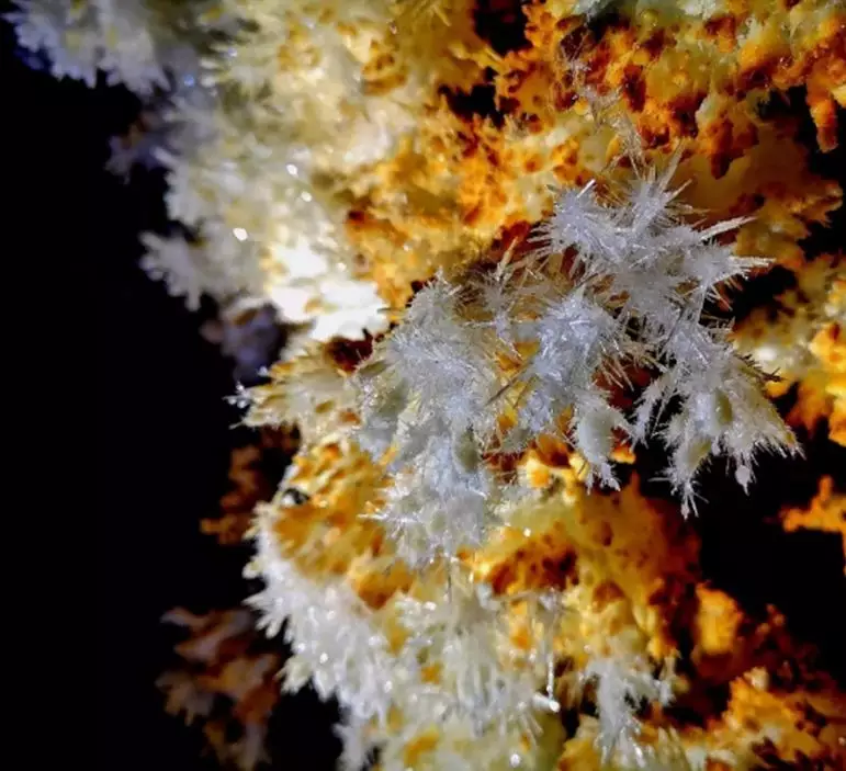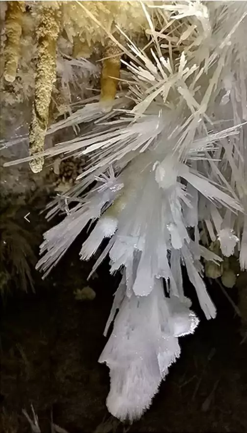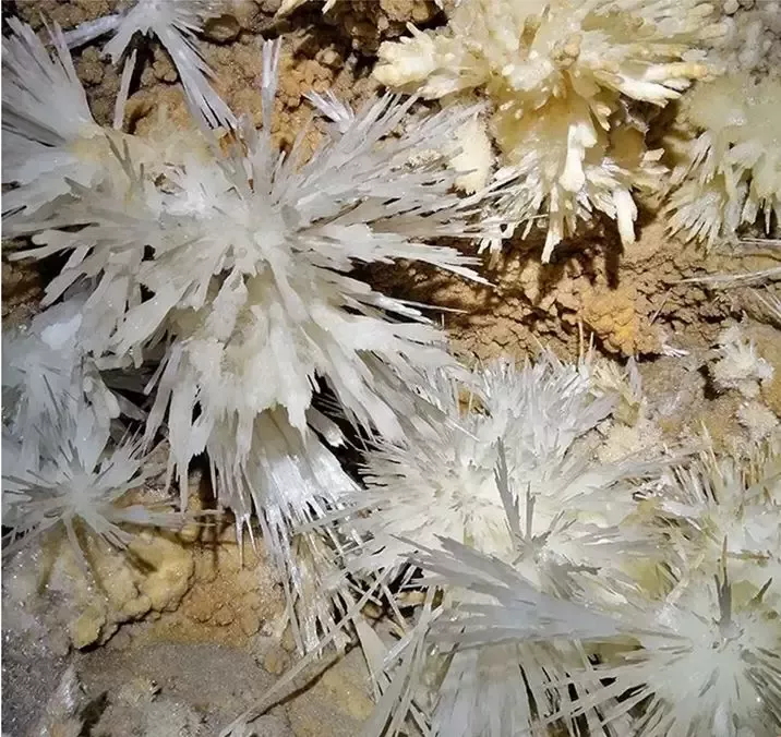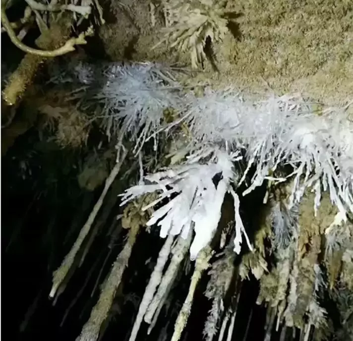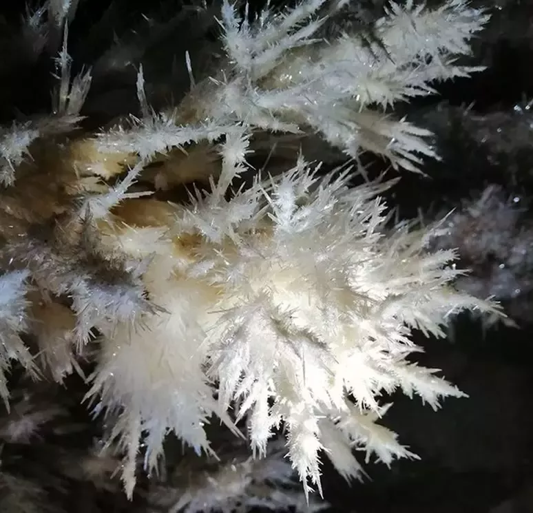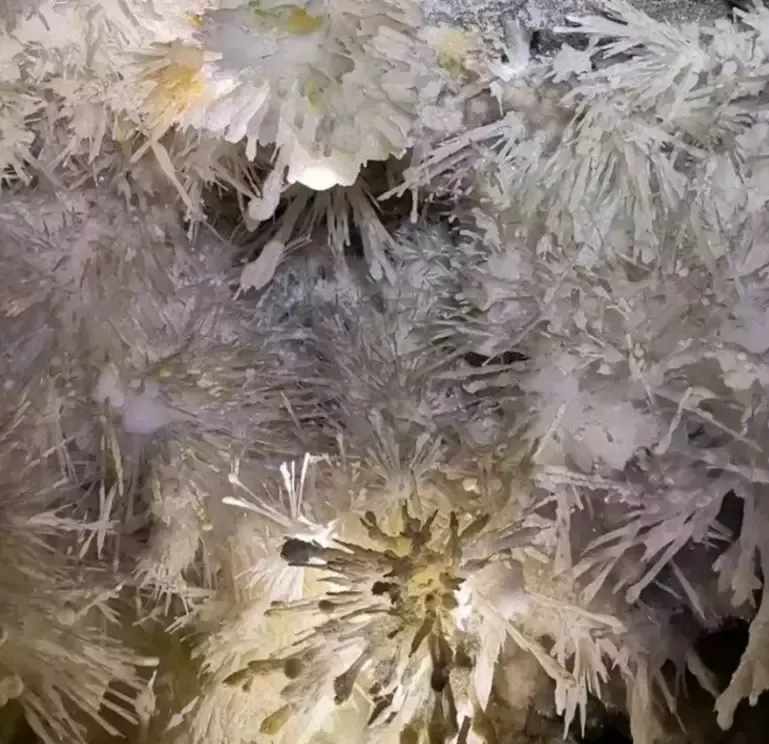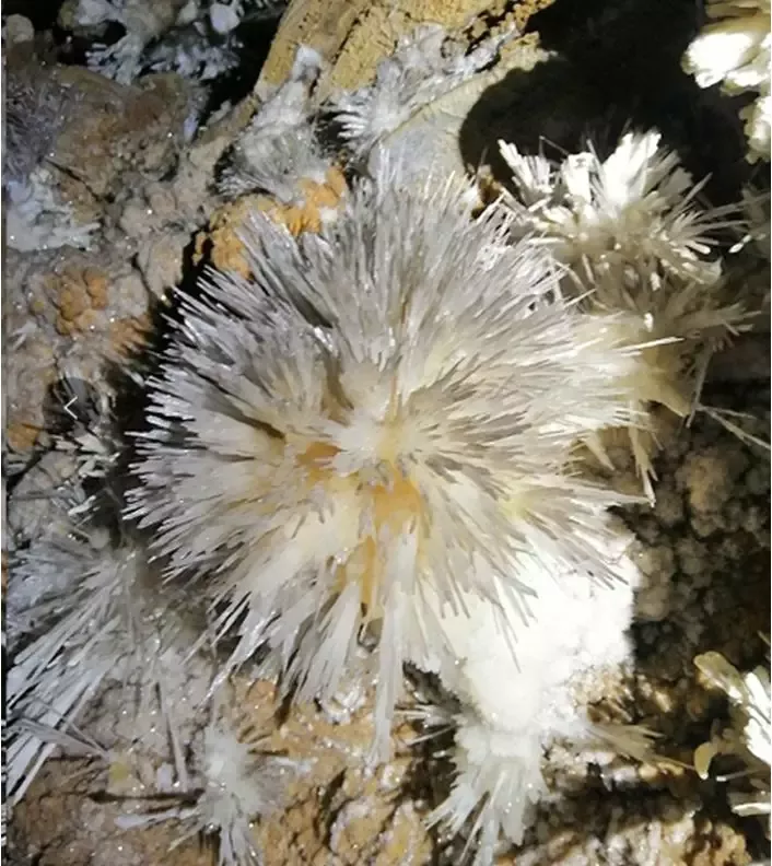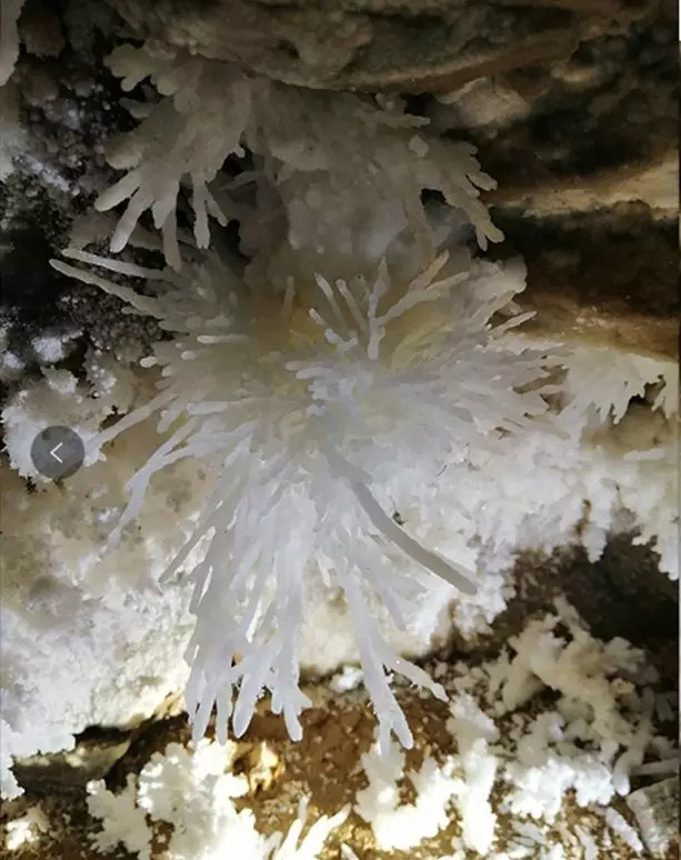 銅仁晶洞宮位于貴州省銅仁市九龍洞溫泉附近的錦江左岸,系2018年4月修建渝懷鐵路復(fù)線時(shí)偶然發(fā)現(xiàn),近日在網(wǎng)上曝光,頓成網(wǎng)紅。專家實(shí)地考察,晶洞宮已勘察兩層洞道,上層約600米,下層約100米;鶐r地層應(yīng)為寒武系白云巖,晶體類型多樣,琳瑯滿目,千姿百態(tài)。主要發(fā)育文石、方解石、石膏三大類晶體,分布面積約1500平方米。晶體形態(tài)有球狀、花狀、枝狀、絮狀、針狀、管狀、柱狀、放射狀、卷曲狀、幕簾狀等十余種,令人驚艷,為國內(nèi)少見,F(xiàn)根據(jù)網(wǎng)上資料,從旅游地學(xué)科普與審美角度,初步歸納、整理如下,供大家分享。