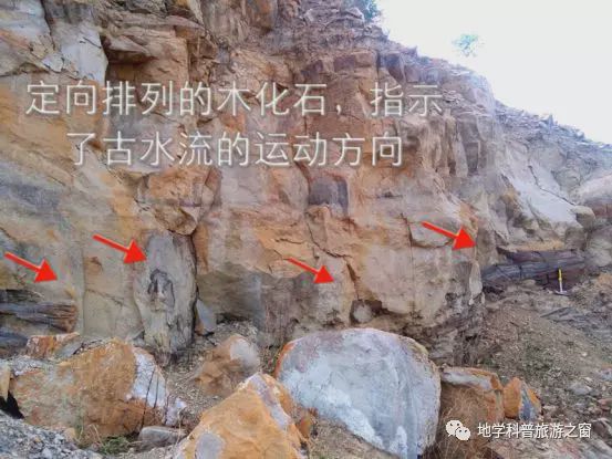 在水泉溝村一帶1km2范圍內(nèi)出露超過30顆硅化木化石,其直徑為30-70cm,可見長度0.5-4米;這些化石均為順層產(chǎn)出,密集分布,屬于異地埋藏類型。