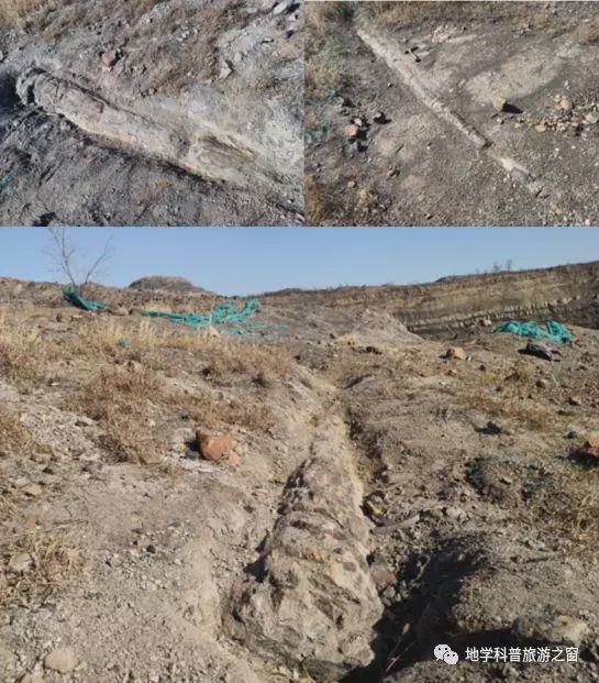 距離水泉溝剖面被1公里左右的一個煤礦露天采坑旁,數(shù)顆硅化木平躺在下往已經(jīng)廢棄的露天煤礦采坑的路上,沿著它的埋藏走向,可能還有更多顆硅化木已經(jīng)被采坑破壞不復(fù)存在。