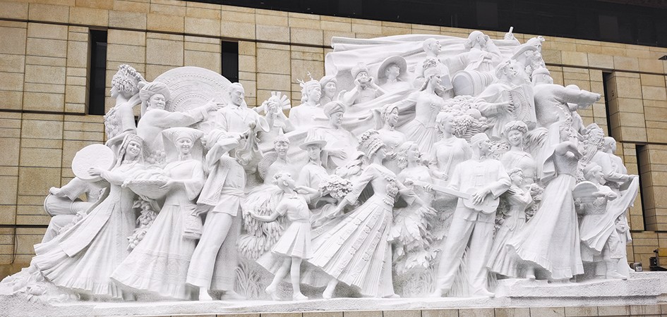 記者跟隨隊(duì)伍進(jìn)入館區(qū),首先映入眼簾的是展覽館廣場(chǎng)上矗立的五大主題雕塑,分別為《旗幟》《信仰》《偉業(yè)》《攻堅(jiān)》《追夢(mèng)》,76個(gè)人物與583塊漢白玉融為一體,靜靜地講述著中國(guó)共產(chǎn)黨一百年來為人民謀幸福、為民族謀復(fù)興的偉大歷程。記者在采訪中了解到,為了尋找合適的漢白玉石材,相關(guān)團(tuán)隊(duì)奔赴全國(guó)各地的礦坑實(shí)地查看石材質(zhì)量,最終選定四川雅安夾金山腳下的漢白玉。一塊塊精選的漢白玉也在默默地訴說著中國(guó)礦業(yè)與中國(guó)共產(chǎn)黨命運(yùn)與共的深厚情緣。