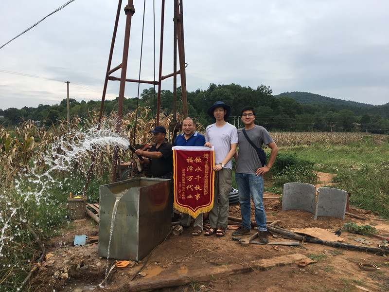 4口井分別位于冷水灘區(qū)楊村甸鄉(xiāng)沙子坳村、花橋街鎮(zhèn)坪塘村、普利橋鎮(zhèn)杉木橋村、祁陽縣文明鋪鎮(zhèn)大泉灣村,幾個村均處于衡紹干旱走廊分布區(qū),生活飲用水問題一直很突出。其中普利橋鎮(zhèn)衫木橋村為國家級脫貧示范村,地形地貌屬于巖溶丘陵谷地,谷地寬300-400米,底部較平緩,山坡坡度20-30度,底部覆蓋的第四系土層厚度3-6米,地層巖性為泥盆系錫礦山組碳酸鹽巖,地層展布、節(jié)理裂隙發(fā)育程度主要受北北東向區(qū)域性斷裂的控制。盡管國家有關(guān)部門已做有前期配套設(shè)計規(guī)劃,但該村現(xiàn)有村民目前飲用水還是以自挖手提井為主,飲用水主要取淺層地表松散層孔隙水,飲用水的水量、水質(zhì)均得不到有效保障,非常不利于國家級脫貧示范村的建設(shè)。野外項(xiàng)目組結(jié)合地方需求以及對該村水文地質(zhì)條件、地質(zhì)構(gòu)造的分析,成功實(shí)施一口探采結(jié)合孔,孔深110米,涌水量為482.6方/天,可為該村5000余人提供水源保障。