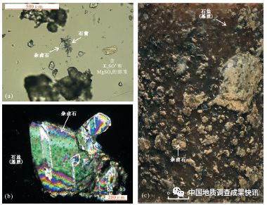 a—雜鹵石水浸反應(yīng);b—含雜鹵石鹽巖鏡下微觀(guān)特征(正交光);c—含雜鹵石鹽巖巖心照片