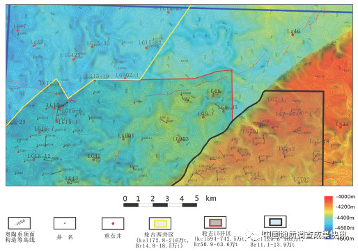 前期塔里木油田利用容積法對油氣探明儲量進行了系統(tǒng)計算,本次在解剖分析地質(zhì)背景、巖石特征及儲層特征的基礎上,利用含水飽和度進行類比,對輪古地區(qū)油田水資源進行了估算。輪古油田分為3個作業(yè)區(qū)(圖2):輪古西井區(qū)、輪古15井區(qū)和輪古7井區(qū)。以輪古西井區(qū)為例, 該井區(qū)探明石油儲量為1600萬t,平均孔隙度為9%,平均滲透率為0.316×10-3μm2,平均含水飽和度為95.2%~96.8%,計算得到水資源量為64000萬~80000萬t,按照平均KCl含量0 . 2 7%計算,輪古西井區(qū)KCl資源量為86.4萬~129.6萬t;按平均Br含量232mg/L計算,Br資源量為7.4萬~9.3萬t。同樣方法計算出輪古15井區(qū)KCl資源量為297萬~445.5萬t,Br資源量為25.5萬~38.3萬t;輪古7井區(qū)KCl資源量為64.8萬~97.2萬t,Br資源量為5.6萬~8.4萬t。最終獲得整個輪古地區(qū)KCl資源量為446.4萬~672.7萬t,達到中小型鉀鹽礦床的規(guī)模;Br資源量為38.5萬~56萬t,達到超大型溴資源礦床規(guī)模。