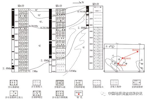 (3)通過鉆孔巖心年代學研究,厘定了該類砂礫層孔隙含鉀鹵水的地質時代與儲鹵層沉積環(huán)境(圖3)。對北部山前帶代表性梁ZK05鉆孔古地磁測年研究可知,B/M界限的深度位于94m處。149m前巖心沉積速率相對較慢(0.14m/ka),推算出鉆孔最頂部年齡約為111ka,這與該區(qū)出露晚更新世地層的實際地質情況相符。149m后沉積速率相對較高(0.2073m/ka)。推算出鉆孔330m深處的年齡為2046ka。這也是砂卵礫石開始堆積的時間。梁ZK02孔巖心古地磁測年求得其底部1000m處年齡為2.58Ma,巖性表現為黃褐色、棕紅色、灰白色含粉砂黏土,而到梁ZK06孔,其底部1000m處古地磁年齡為2.1Ma,巖性為粗粒含粉砂石鹽。以上表明,由北部阿爾金山前向南大浪灘干鹽湖凹陷中心,巖相由扇三角洲前緣的砂礫逐漸過渡到濱湖的含粉砂黏土(梁ZK02),直至鹽湖沉積(梁ZK06)。由此可知,這種新型砂礫層含鉀鹵水儲鹵層形成時代為2.58~2.00Ma,為早更新世早期(鄭綿平等,2015)。