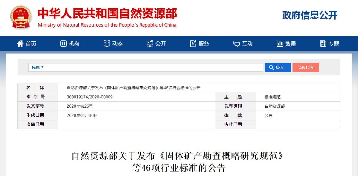 自然資源部關(guān)于發(fā)布《固體礦產(chǎn)勘查概略研究規(guī)范》