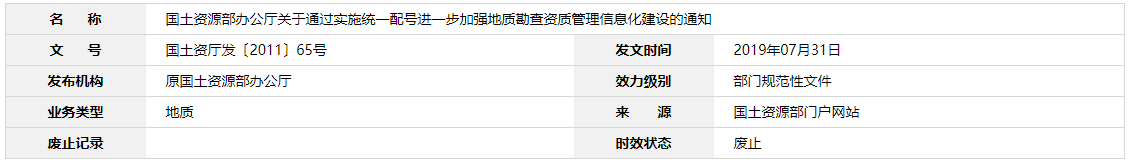 為提高地質(zhì)勘查資質(zhì)管理水平,完善地質(zhì)勘查資質(zhì)信息系統(tǒng)建設(shè),更好地應(yīng)用信息化手段促進地質(zhì)勘查資質(zhì)管理工作的規(guī)范化,實現(xiàn)政務(wù)信息公開,提高透明度,現(xiàn)就通過實施統(tǒng)一配號進一步加強地質(zhì)勘查資質(zhì)管理信息化建設(shè)有關(guān)事項通知如下: