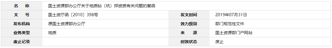 國土資源部辦公廳關于地質(zhì)鉆(坑)探資質(zhì)有關問題的復函