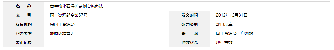《古生物化石保護(hù)條例實(shí)施辦法》已經(jīng)2012年12月11日國土資源部第4次部務(wù)會(huì)議通過,現(xiàn)予以發(fā)布,自2013年3月1日起施行。