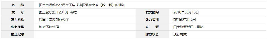 | 國(guó)土資源部辦公廳關(guān)于申報(bào)中國(guó)溫泉之鄉(xiāng)(城、都)的通知 |