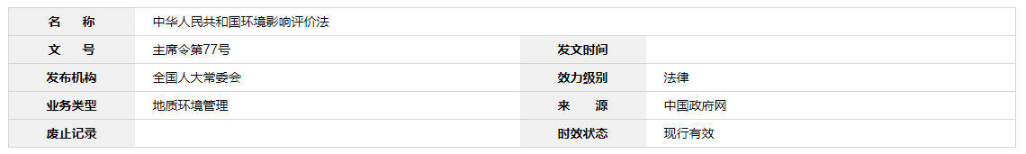 《中華人民共和國環(huán)境影響評價法》已由中華人民共和國第九屆全國人民代表大會常務委員會第三十次會議于2002年10月28日通過,現(xiàn)予公布,自2003年9月1日起施行。
